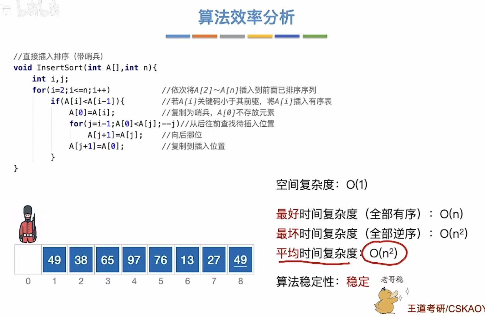 优点:不用每轮循环都判断j>=0,因为当 j = 0 时,A[0] 正是待插入的值,比较会自然停止;