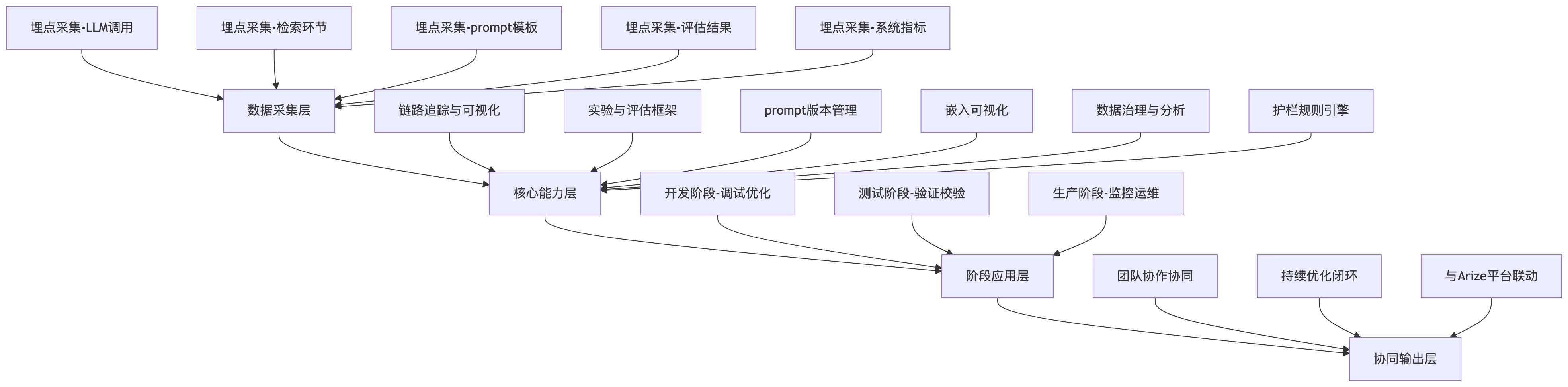 协同输出层:实现跨团队协同和持续优化,支持开发、测试、运维、产品团队基于同一套数据协作,同时与Arize平台深度联动,打通开发与生产的数据壁垒,形成"发现问题-分析问题-优化验证-上线迭代"的完整闭环。