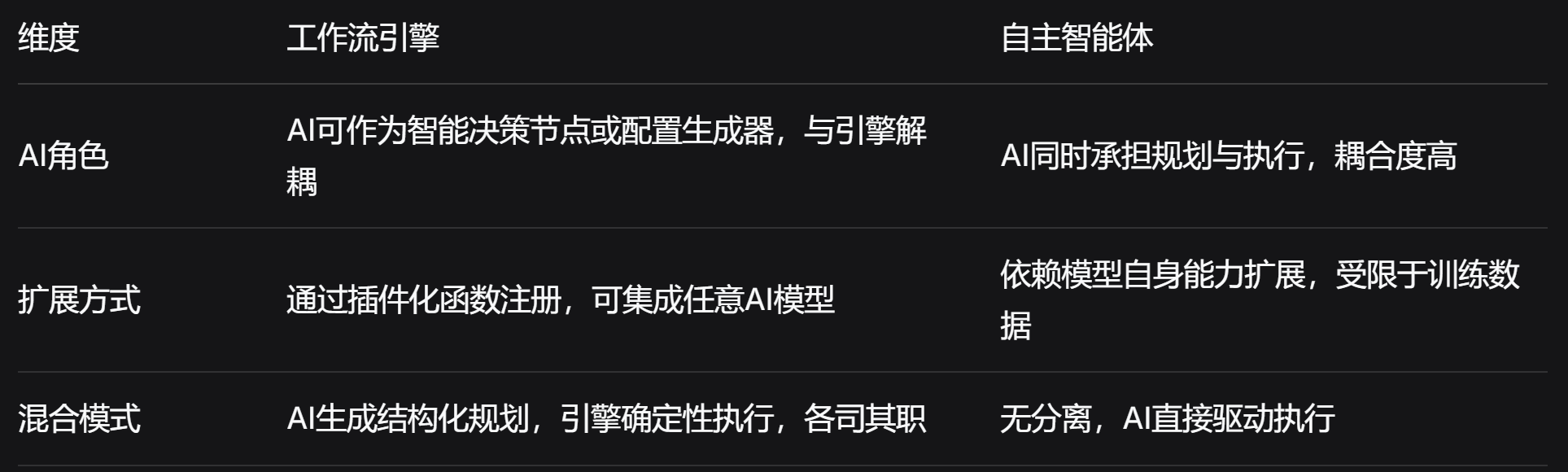 当AI能力足够强大时,工作流引擎可以将其作为规划器:由AI分析任务需求,输出结构化的工作流定义(含并行分支、依赖关系),然后由引擎负责可靠执行。这种"AI规划+引擎执行"的混合模式既发挥了AI的创意与推理能力,又保留了生产级自动化所需的确定性、可观测性和并行效率。而自主智能体将规划与执行耦合在单一模型中,难以在复杂场景下保证可靠性。