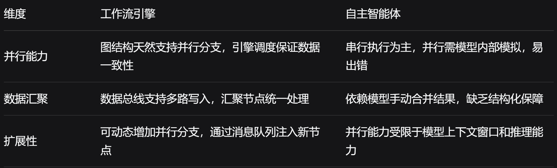 工作流引擎将并行视为显式图结构,开发者可以精确控制并发粒度。而自主智能体的并行本质上是"伪并行"------模型通过交替调用工具模拟并行,无法真正同时执行多个独立任务,且数据汇聚依赖模型自身的合并逻辑,容易引入错误。