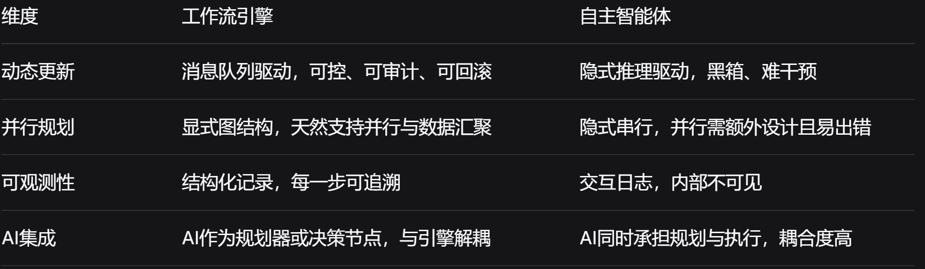 工作流引擎通过消息队列解耦了更新决策与更新执行,将动态性转化为可编程、可观测的确定性行为。这一架构使其成为自主智能体的理想执行底座------智能体负责思考,引擎负责执行,两者协同实现"智能规划+可靠运行"的下一代自动化平台。而纯自主智能体模式受限于黑箱决策和串行执行,难以胜任高复杂度、高可靠性的生产环境。