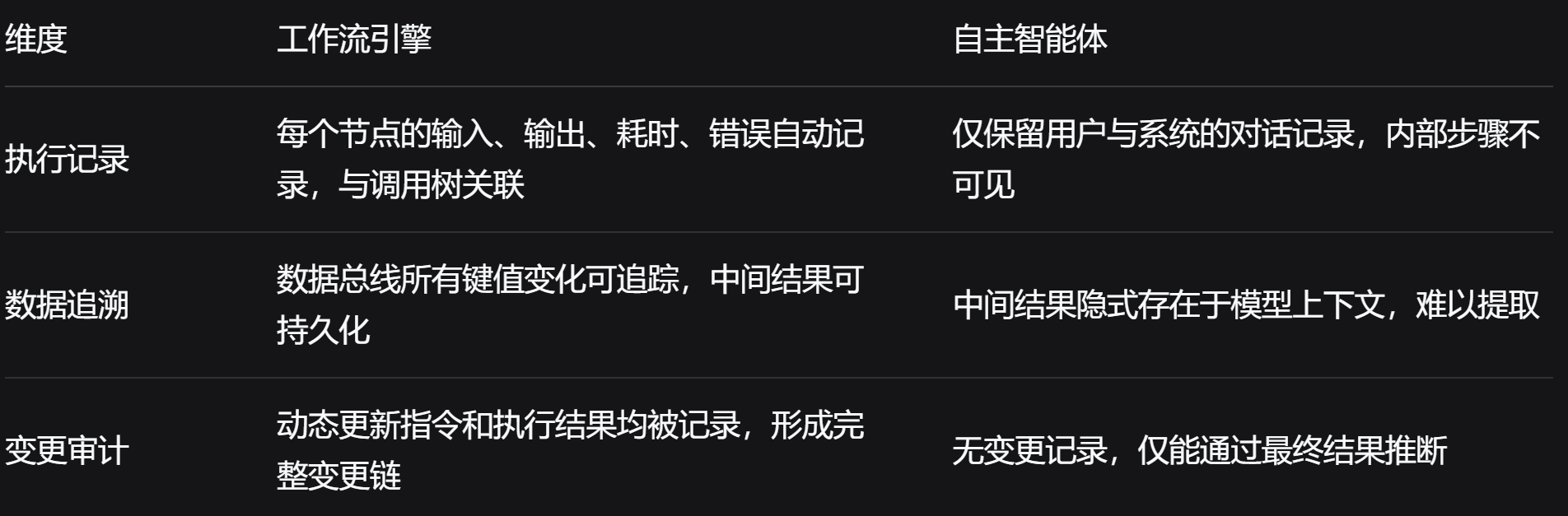 对比自主智能体:仅保留对话日志,内部不可见,问题排查困难。