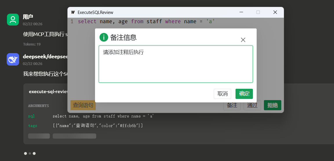 调用MCP执行SQL时会自动弹出消息框,倒计时结束前未审批会自动拒绝该SQL的执行,此外可以通过备注介入,给AI合理的建议。