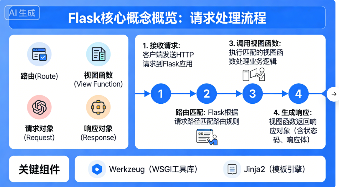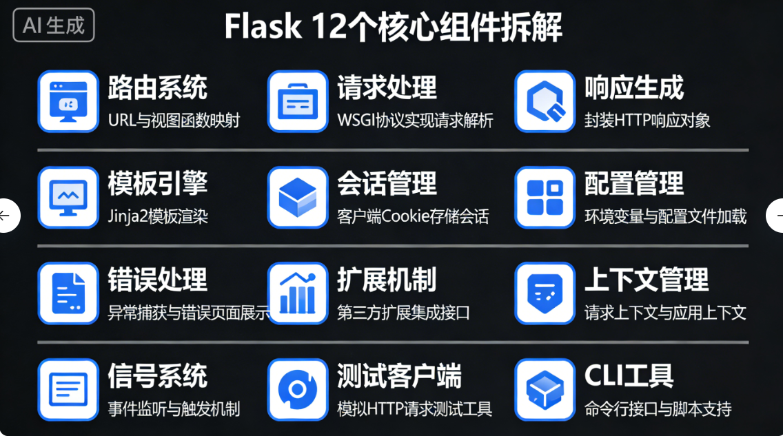 想要从"写 Demo"晋升为"做项目",必须深入理解 Flask 的核心概念。本篇将带你像拆解乐高积木一样,拆解 Flask 的 12 个核心组件。