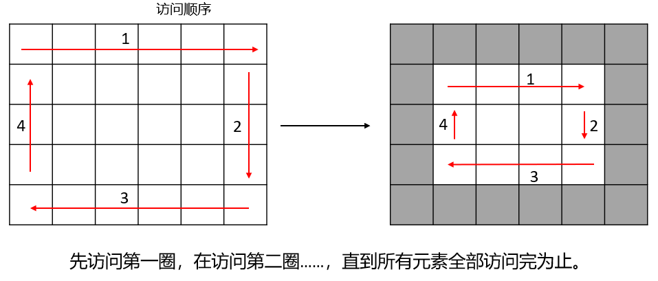 这题是让顺时针螺旋顺序返回矩阵中的所有元素,我们可以直接模拟,从外到内一圈一圈的打印矩阵中的元素,需要使用4个变量来记录访问的位置,直到全部元素都访问完为止,如下图所示。