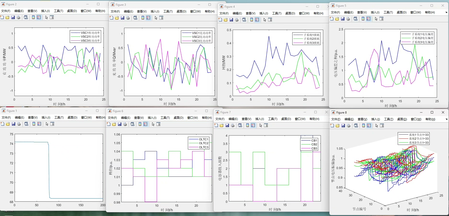 最终跑出来的帕累托前沿显示,当允许OTLC动作8次、CB动作12次时,网损能降23%,电压偏差缩小41%。有意思的是VSC的无功出力呈现明显时空互补特性------白天光伏大发时,相邻子系统的VSC会主动吸收无功来平抑电压波动。