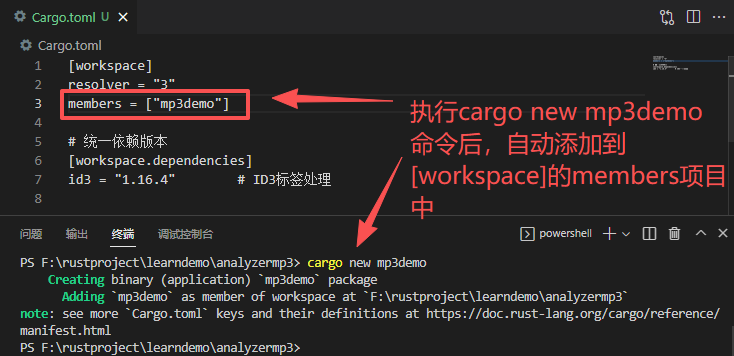 切换到该目录下,新建工程cargo new mp3demo,这个时候在[workspace]项目中自动添加mp3demo项目。