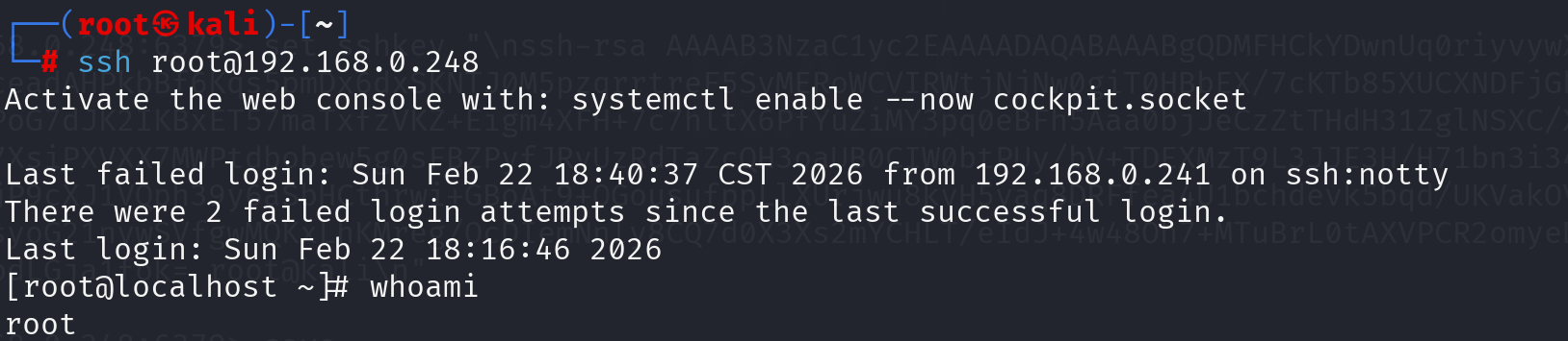 原理:Linux SSH 公钥认证的核心是「客户端(Kali)的公钥写入服务端(CentOS)/root/.ssh/authorized_keys 文件」,服务端 SSH 服务会验证该文件中的公钥,匹配成功则免密码登录。Redis 利用 CONFIG SET 修改持久化目录为 /root/.ssh/、文件名改为 authorized_keys,将 Kali 的 SSH 公钥写入该文件,从而实现免密码登录。