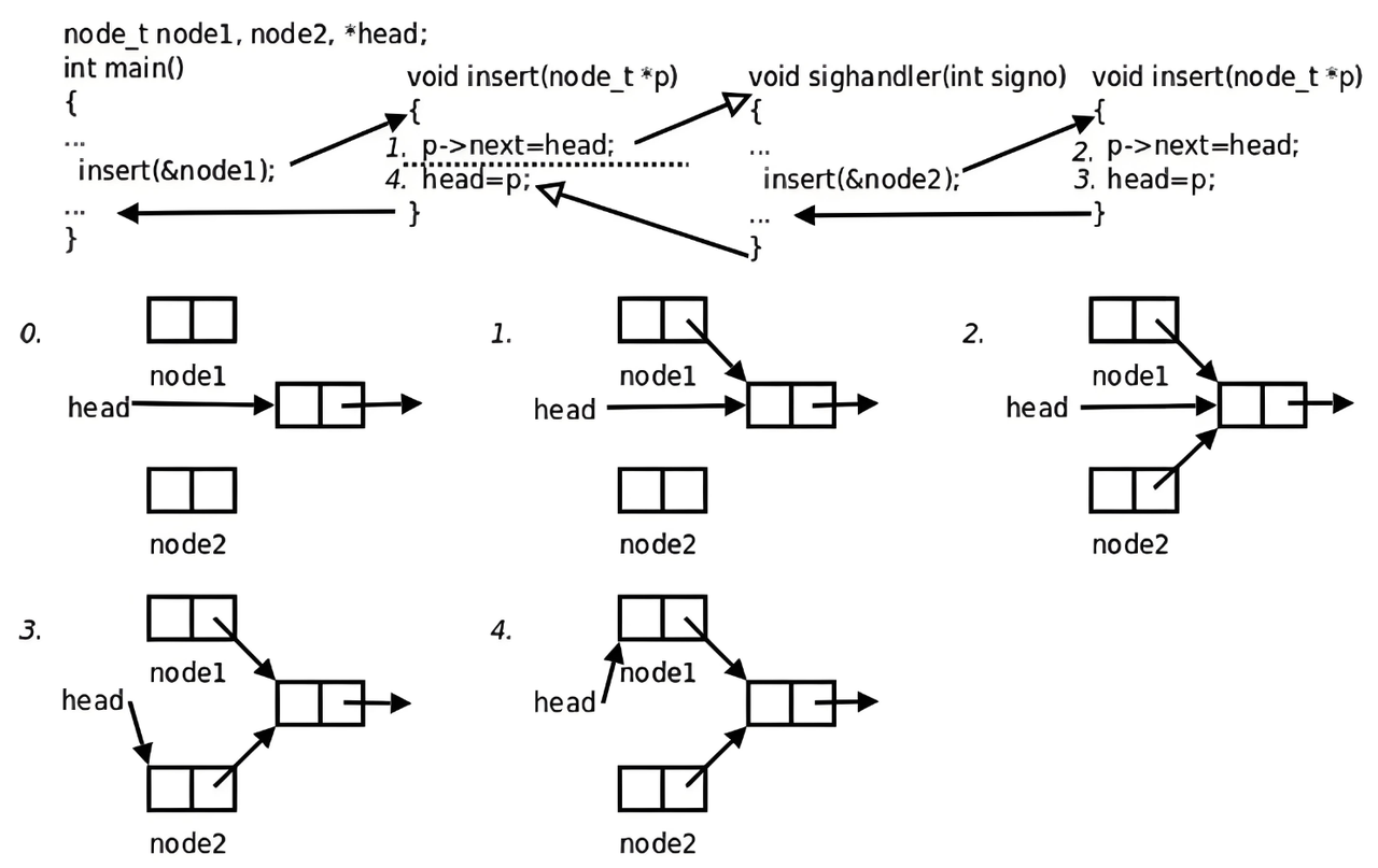 主程序调用**insert函数向全局链表插入节点node1,执行到一半时,被信号处理函数打断;信号处理函数也调用insert函数向同一个全局链表插入节点node2,执行完成后切回主程序;主程序继续执行insert**的剩余逻辑,最终导致链表数据错乱。