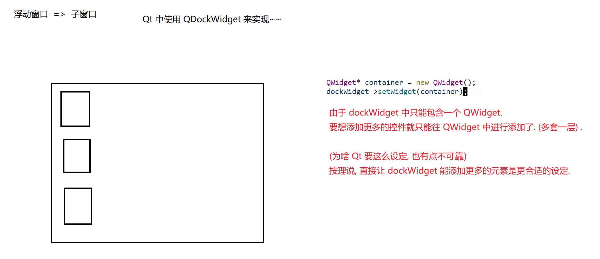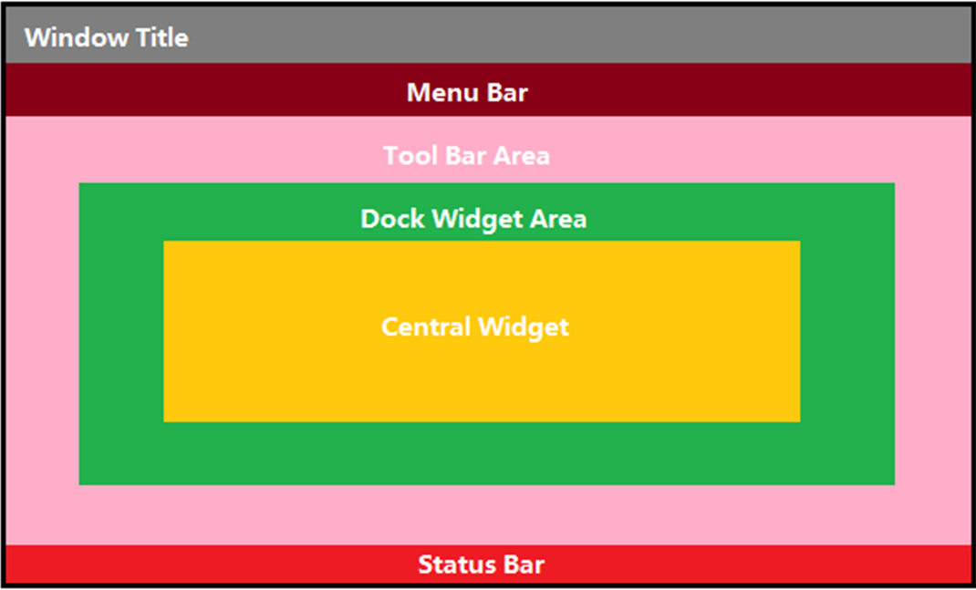 QMainWindow 是⼀个为用户提供主窗口程序的类,继承自QWidget 类,并且提供了⼀个预定义的布局。QMainWindow 包含一个菜单栏(menu bar) 、多个工具栏(tool bars) 、多个浮动窗口(铆接部件)(dock widgets) 、⼀个状态栏(status bar) 和**⼀个中心部件(central widget)**,它是许多应用程序的基础,如文本编辑器,图片编辑器等。如下图为 QMainwindow中各组件所处的位置.