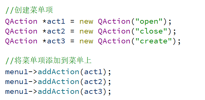 在 Qt 中,并没有专门的菜单项类,可以通过 QAction 类,抽象出公共的动作。如在菜单中添加菜单项.