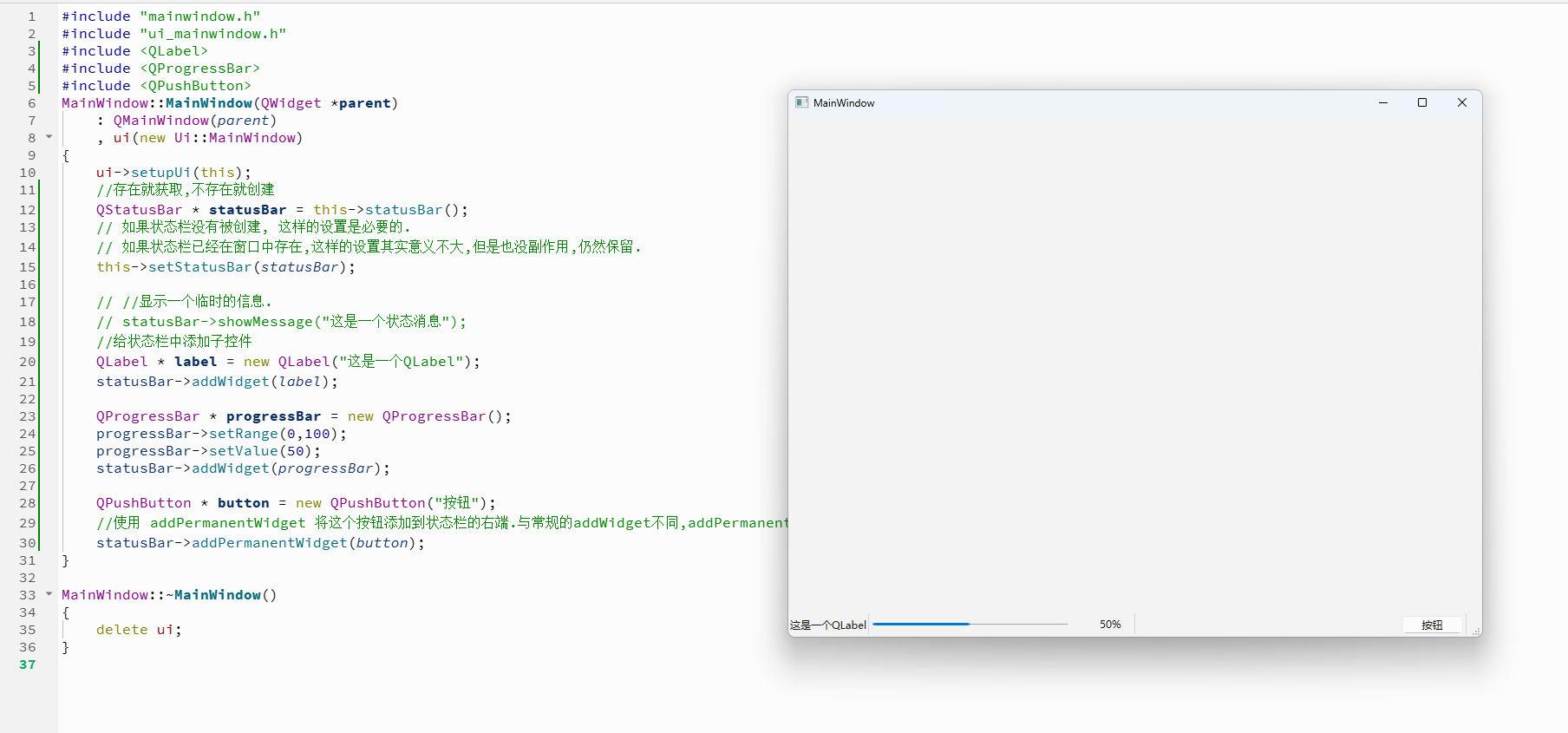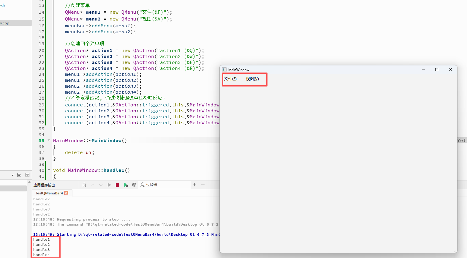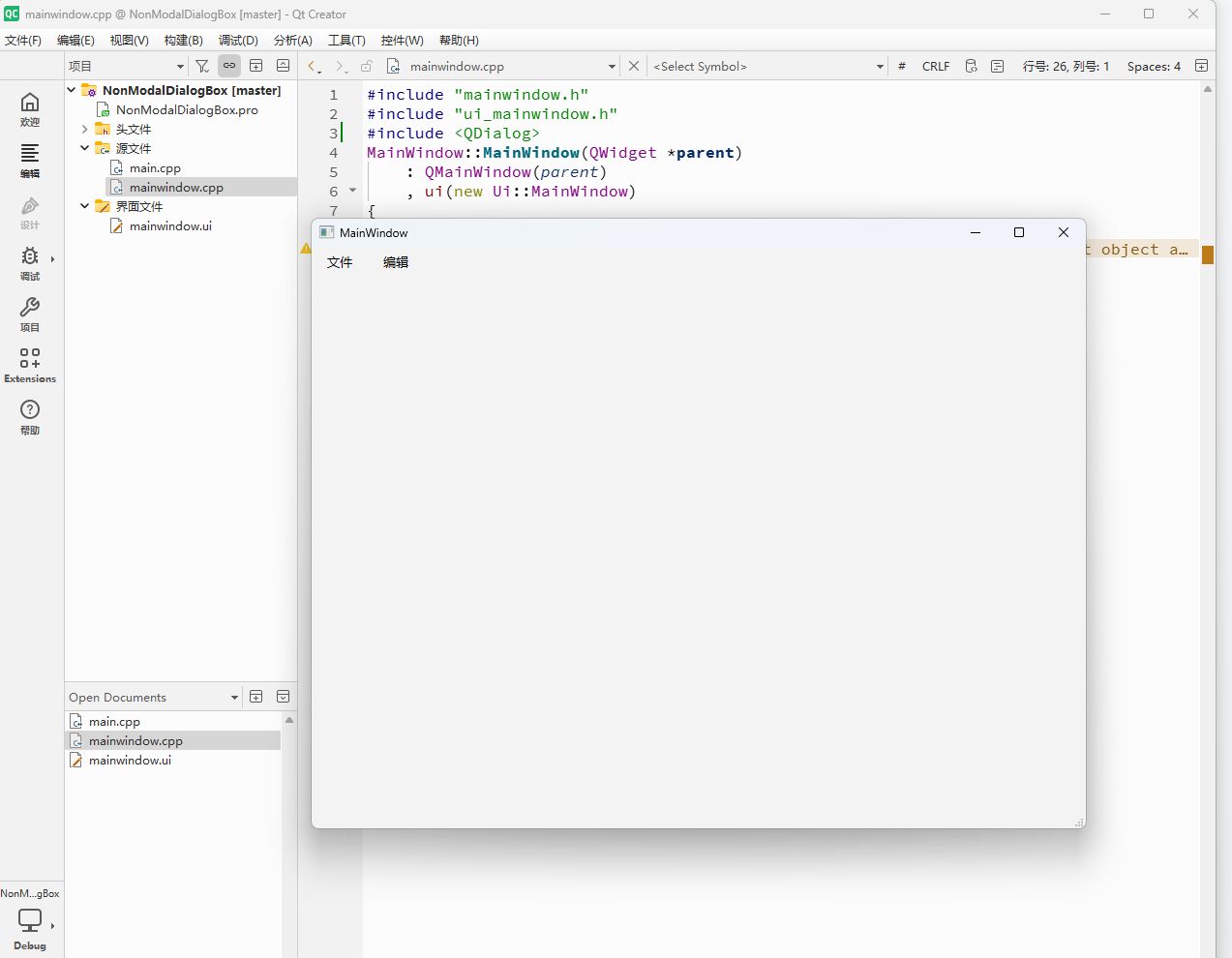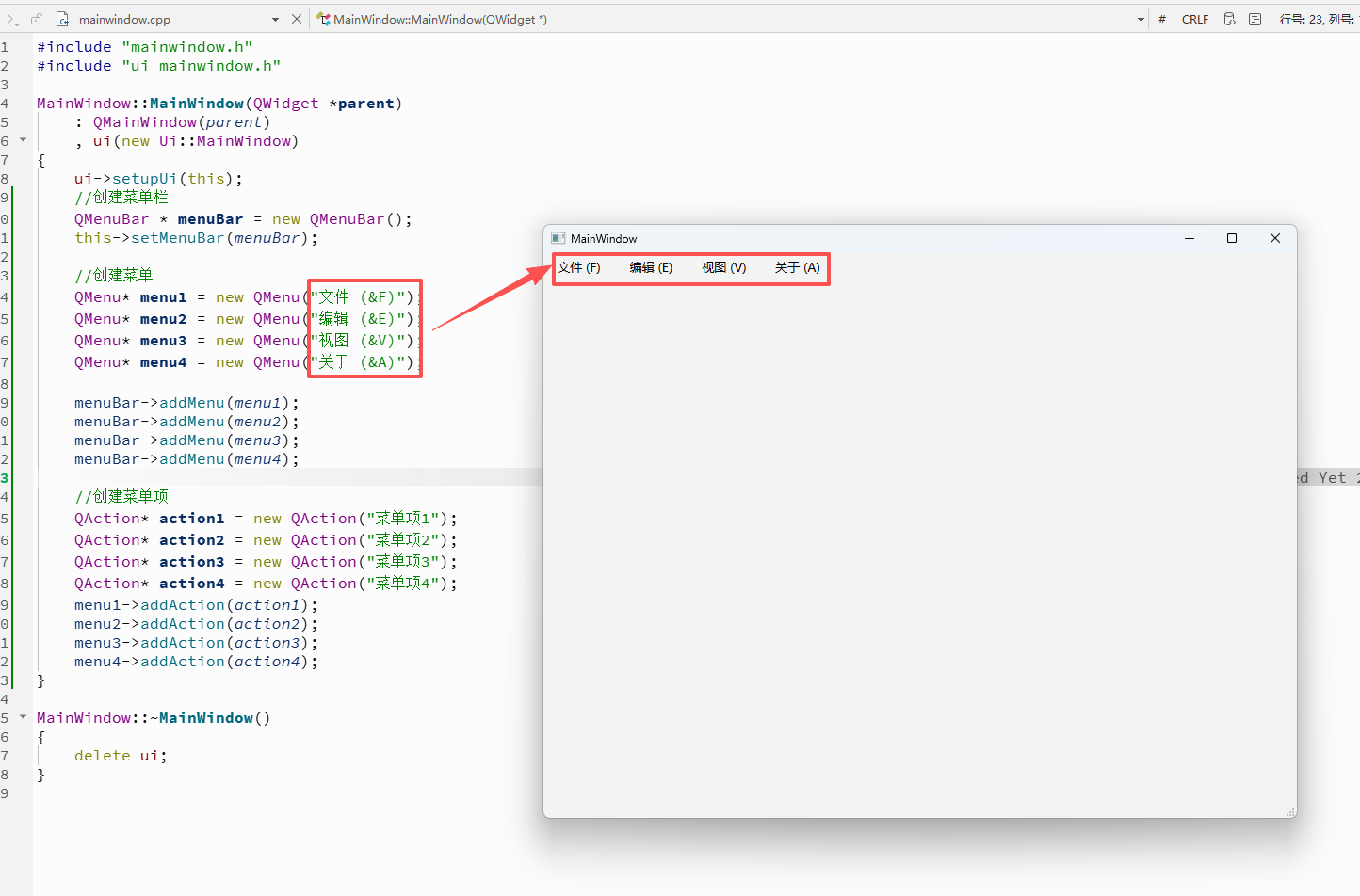 在 "mainwindow.cpp" 文件中创建菜单和中央控件.