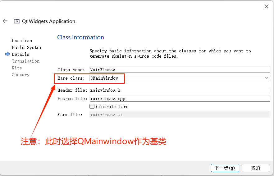 注意:此时新建项目时选择的基类 QMainwindow ,如下图示: