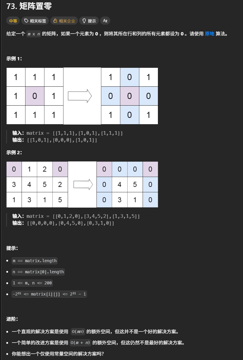 - 空间效率:它通过复用矩阵的第一行和第一列作为 "标记位",将空间复杂度从 O (mn) 或 O (m+n) 优化到了 O (1),只使用了两个布尔变量。