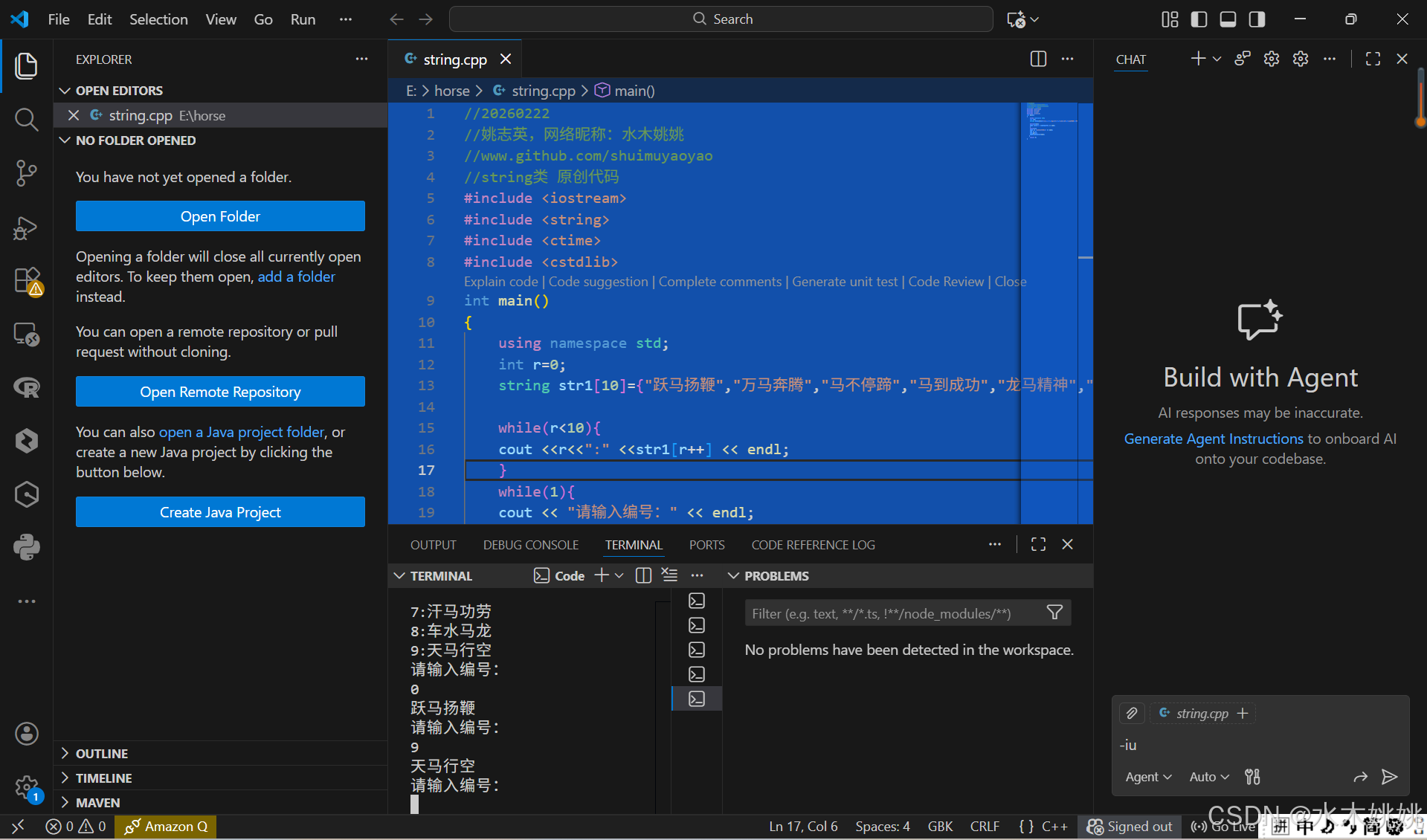 今年是马年,编写了一段关于马小程序。用来测试C++语言中的string对象。下面是运行结果。