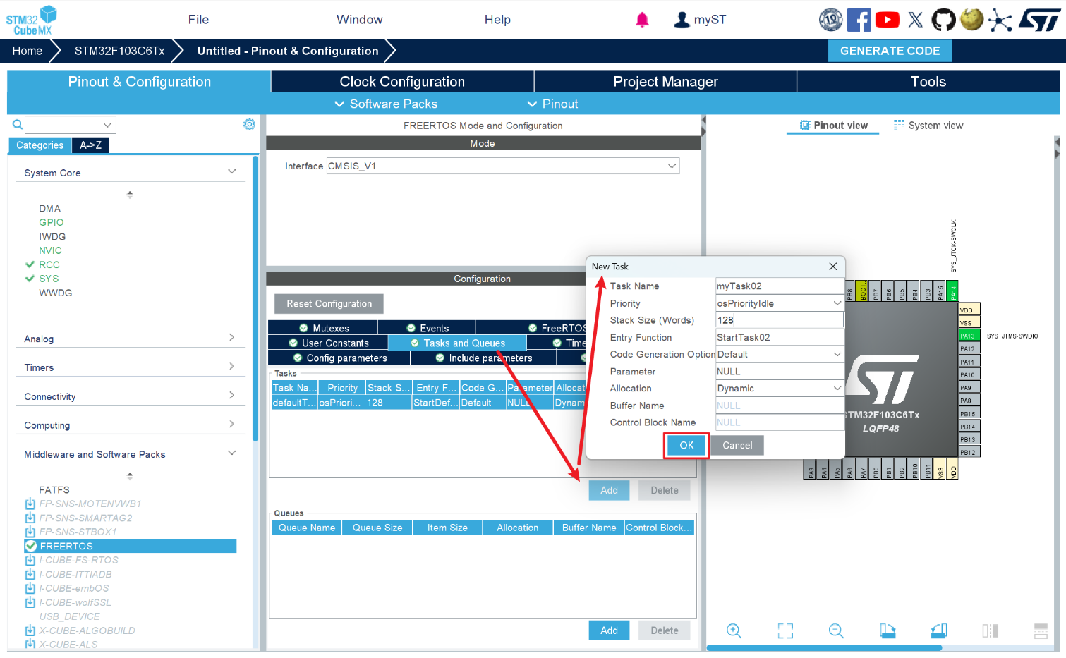 - 进入Tasks and Queues可添加新的任务函数(如myTask02,新手可保持默认)。其他参数(如任务栈大小、优先级、队列/信号量)后续可在代码中配置,无需提前修改。