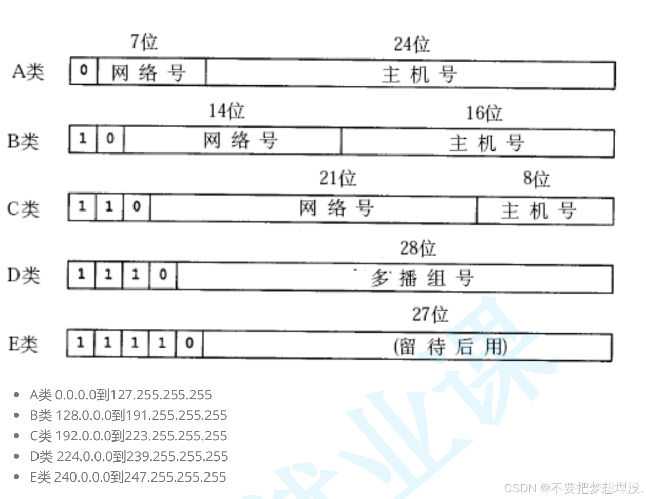 过去曾经提出一种划分网络号和主机号的方案, 把所有IP 地址分为五类, 如下图所示(该图出 自[TCPIP]