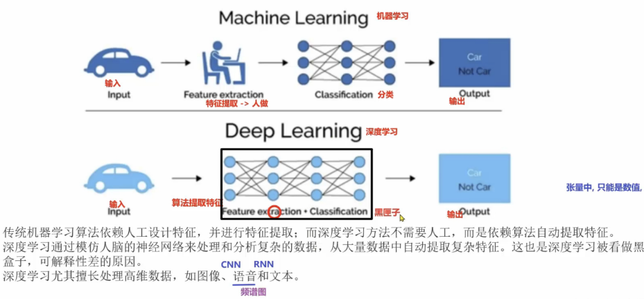 传统机器学习算法依赖人工设计特征,并进行特征提取;而深度学习方法不需要人工,而是依赖算法自动提取特征。