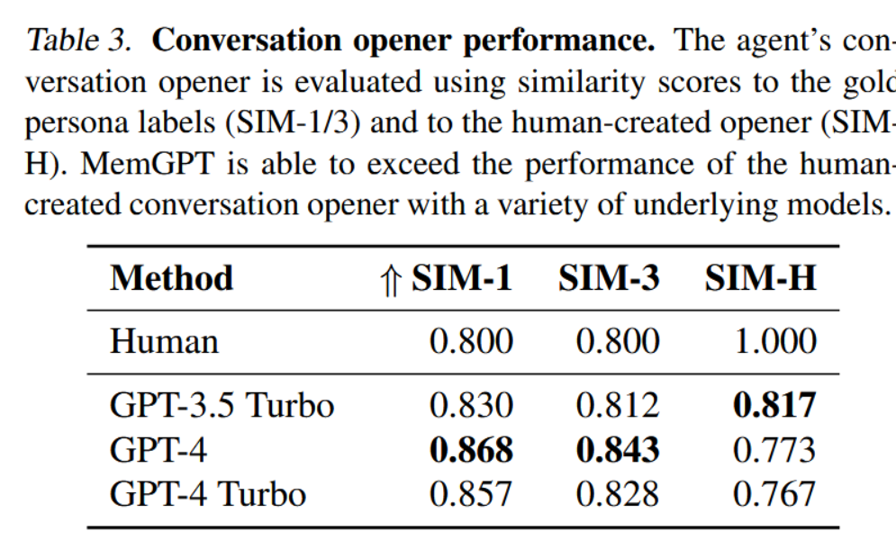 表3:对话开场白表现评估。智能体的对话开场白通过其与标准人物标签的相似度评分(SIM-1/3)以及与人工创建开场白的相似度评分(SIMH)进行评估。MemGPT能够凭借多种底层模型,在性能上超越人工创建的对话开场白。