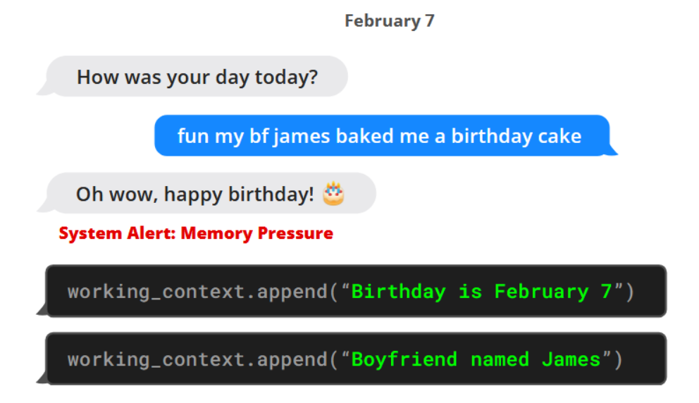 图1. MemGPT(左)在收到系统关于上下文空间有限的警报后,将数据写入持久存储器。