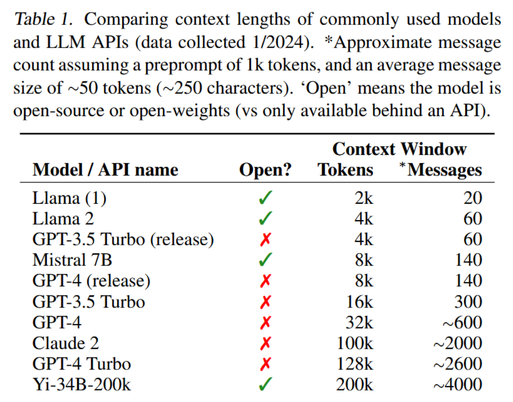 表1. 常用模型与LLM API的上下文长度对比(数据收集于2024年1月)。*基于1k令牌的系统预设提示词及平均每条消息约50令牌(约250字符)估算的近似消息条数。"开源"指该模型为开源或开放权重(相对于仅能通过API调用)。
