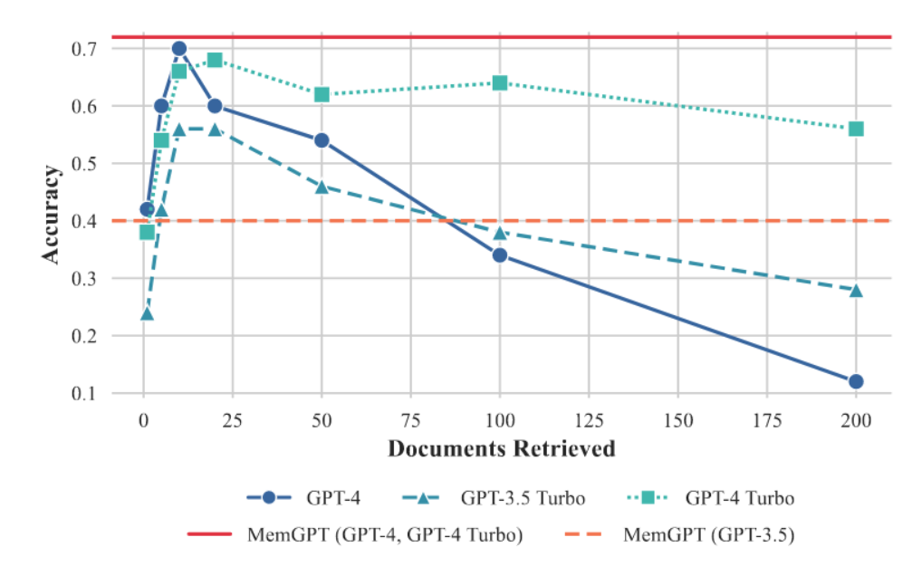 由于基于嵌入的相似性搜索存在局限性,文档问答任务对所有方法都具有挑战性。我们观察到,选定问题的标准答案文档(依据NaturalQuestions-Open标注)常常出现在前十几个检索结果之外,有时甚至更靠后。检索器的性能直接影响了固定上下文基线结果:GPT-4在检索文档较少时准确率相对较低,随着更多文档被添加到上下文窗口,其准确率持续提升,这是因为模型能正确地将回答限制在检索到的文档信息范围内。尽管MemGPT在理论上不受次优检索器性能(即便基于嵌入的排序存在噪声),只要检索器完整排名中包含目标文档(通过分页机制增加检索调用次数仍可定位到该文档),我们观察到MemGPT在尚未穷尽检索器数据库前,就经常会停止翻阅检索结果。
