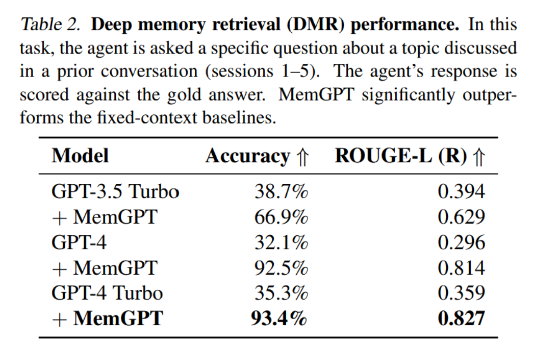 表2:深层记忆检索(DMR)性能。在此任务中,智能体被询问关于先前对话(第1至5轮)中讨论过的某一主题的具体问题。将智能体的回答与标准答案进行比对评分。MemGPT显著优于固定上下文基线模型。
