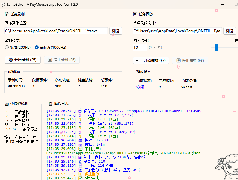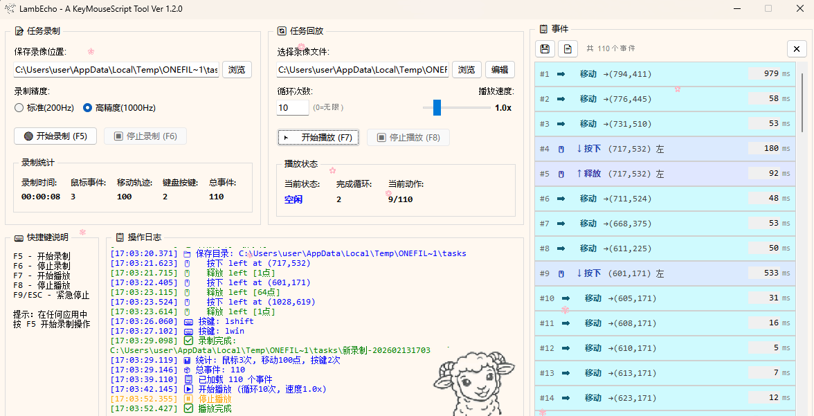 一款 Windows 平台下的键鼠脚本录制与回放工具,支持高精度录制鼠标点击、移动轨迹和键盘操作,并可以精确回放。适用于自动化测试、重复性任务执行、游戏辅助等场景。