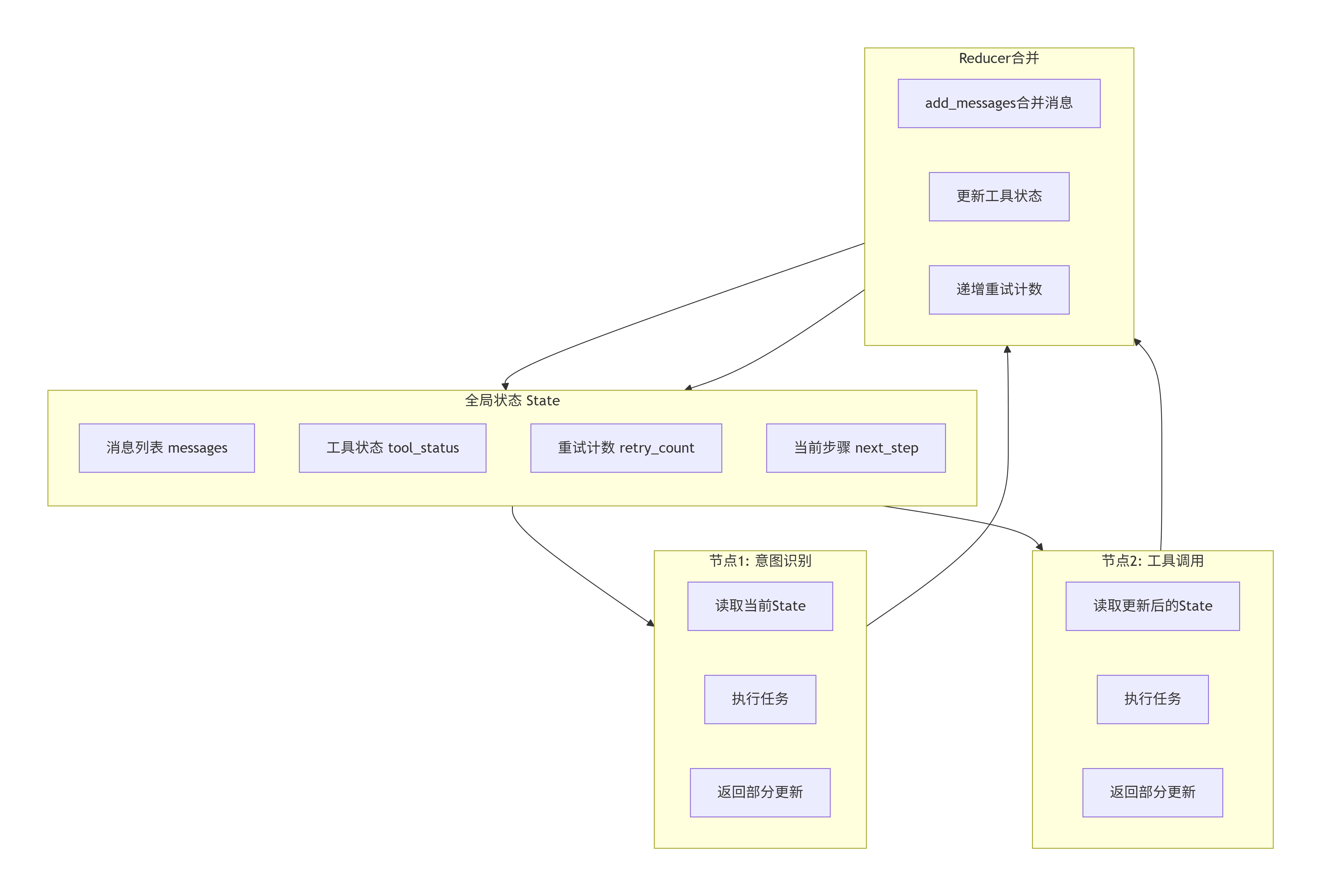 LangGraph框架会自动将节点的部分更新合并到全局State中。这个过程通过Reducer函数控制,确保更新的确定性。