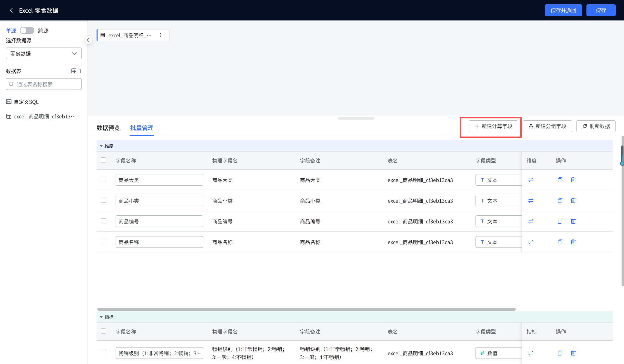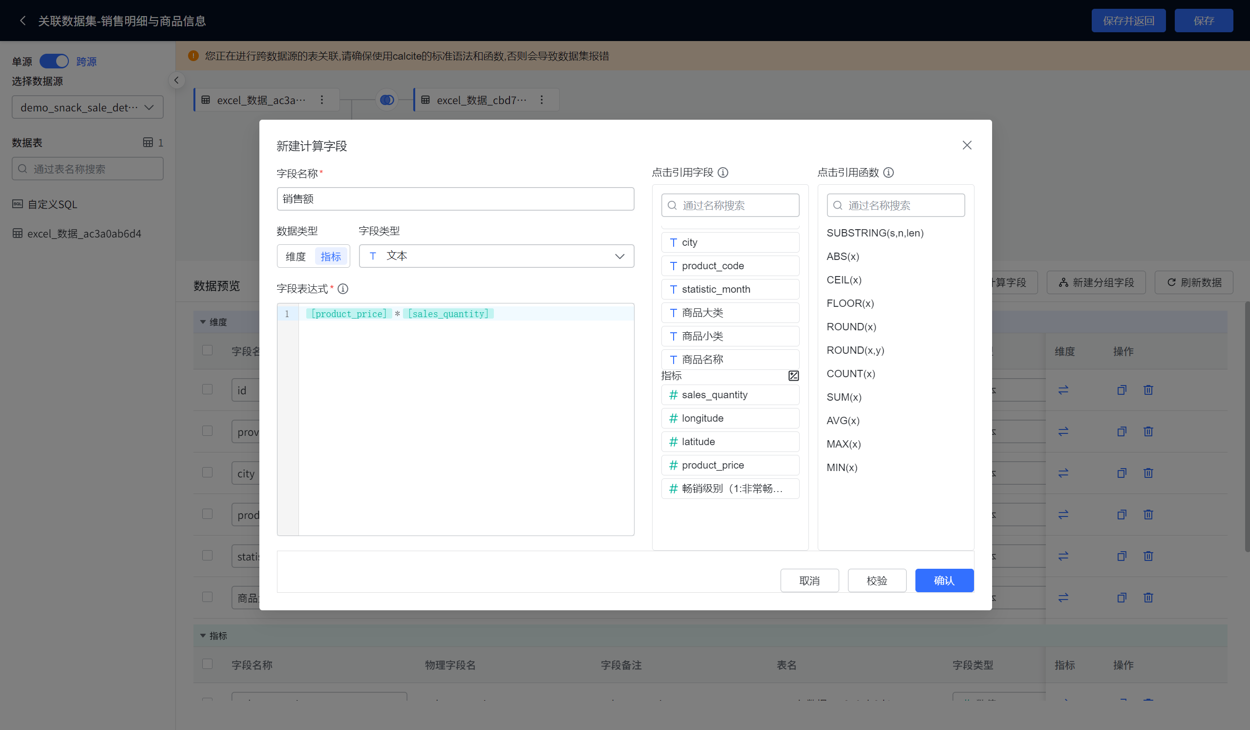 计算字段 是数据集管理中最强大的功能之一。它允许您基于现有字段,通过公式或函数创建出新的衍生字段,而无需修改原始数据源。这极大地扩展了数据分析的深度和灵活性。