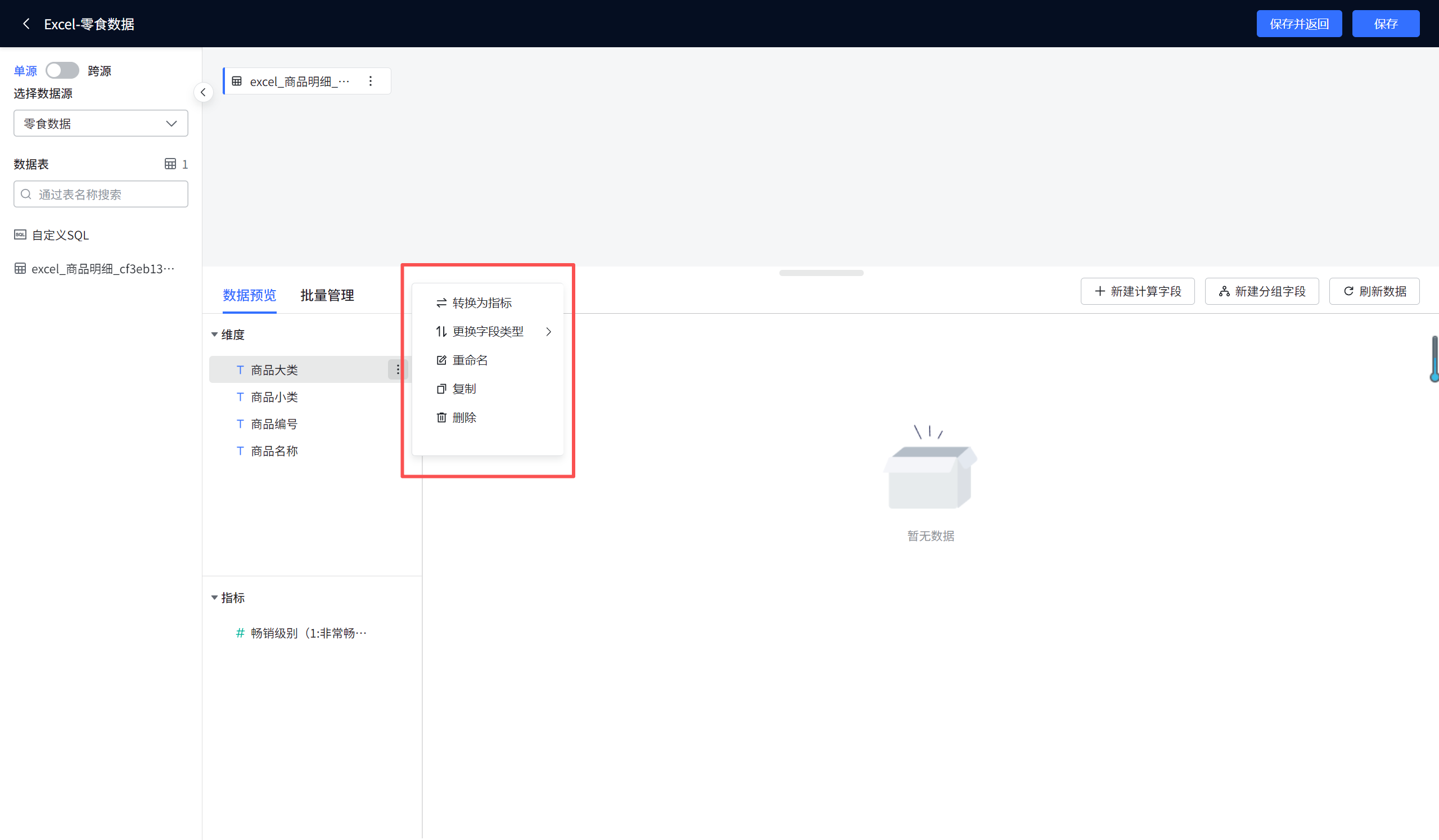 - 操作 :DataEase会根据字段的数据类型自动判断其初始角色,但您可以根据分析需求手动切换。例如,将数值型的"客户ID"从指标 转换为维度,以便按客户进行计数分析;或将文本型的"年份"(如"2023")从维度转换为指标以进行某些特定计算。这决定了该字段在后续图表制作中默认的使用方式。