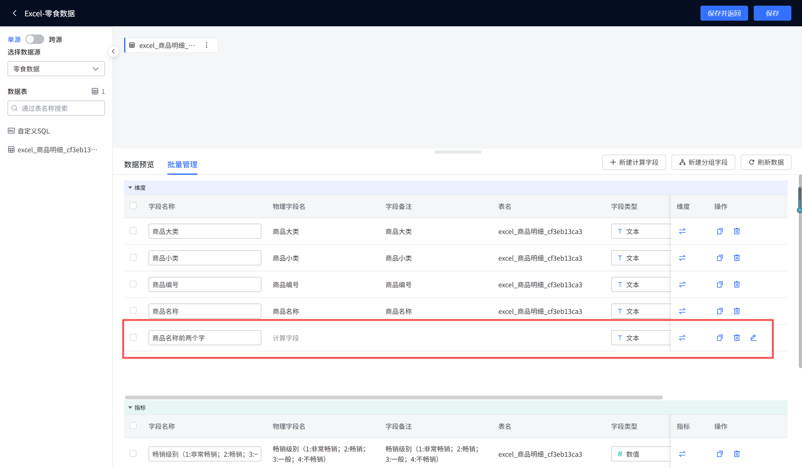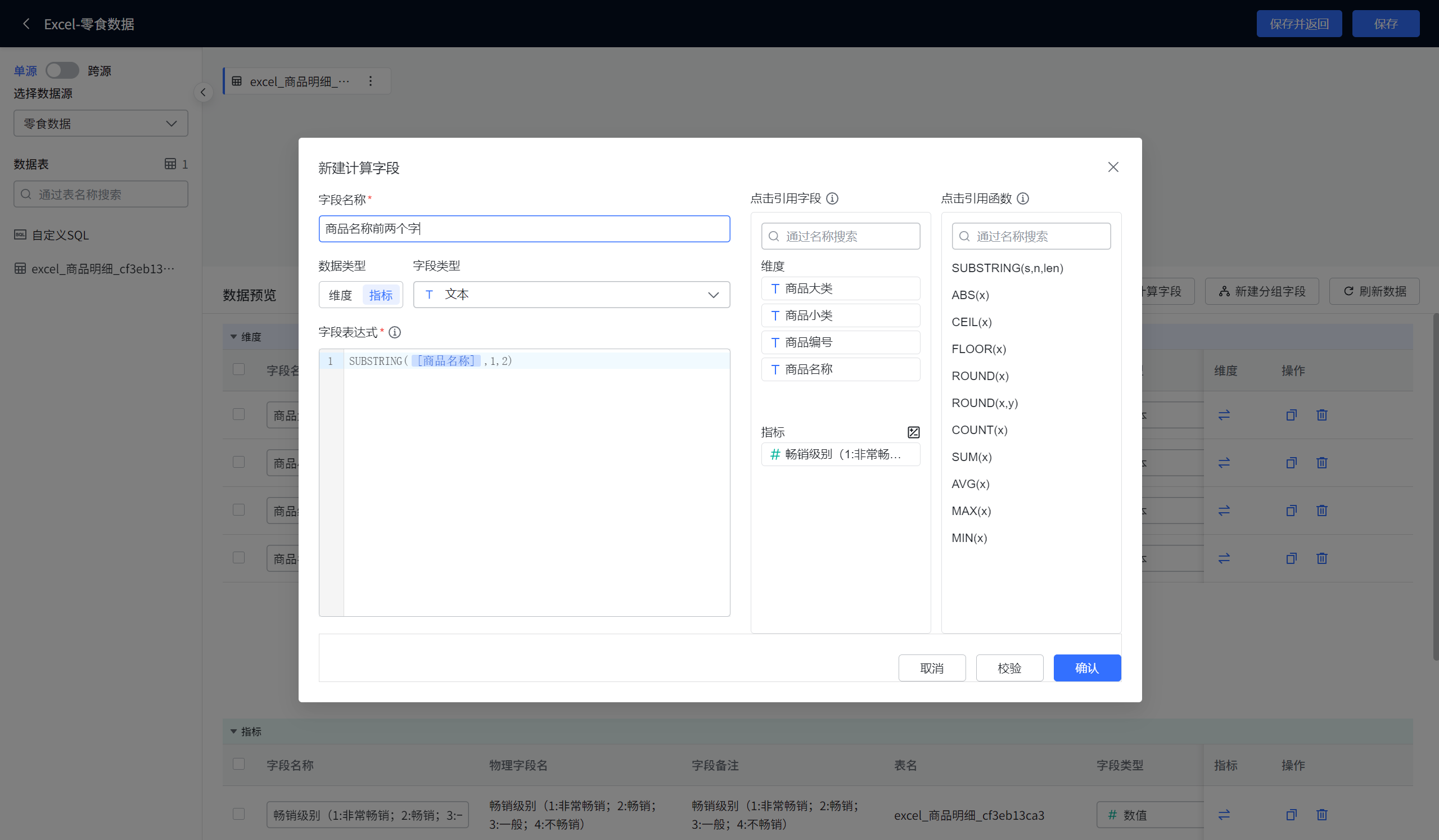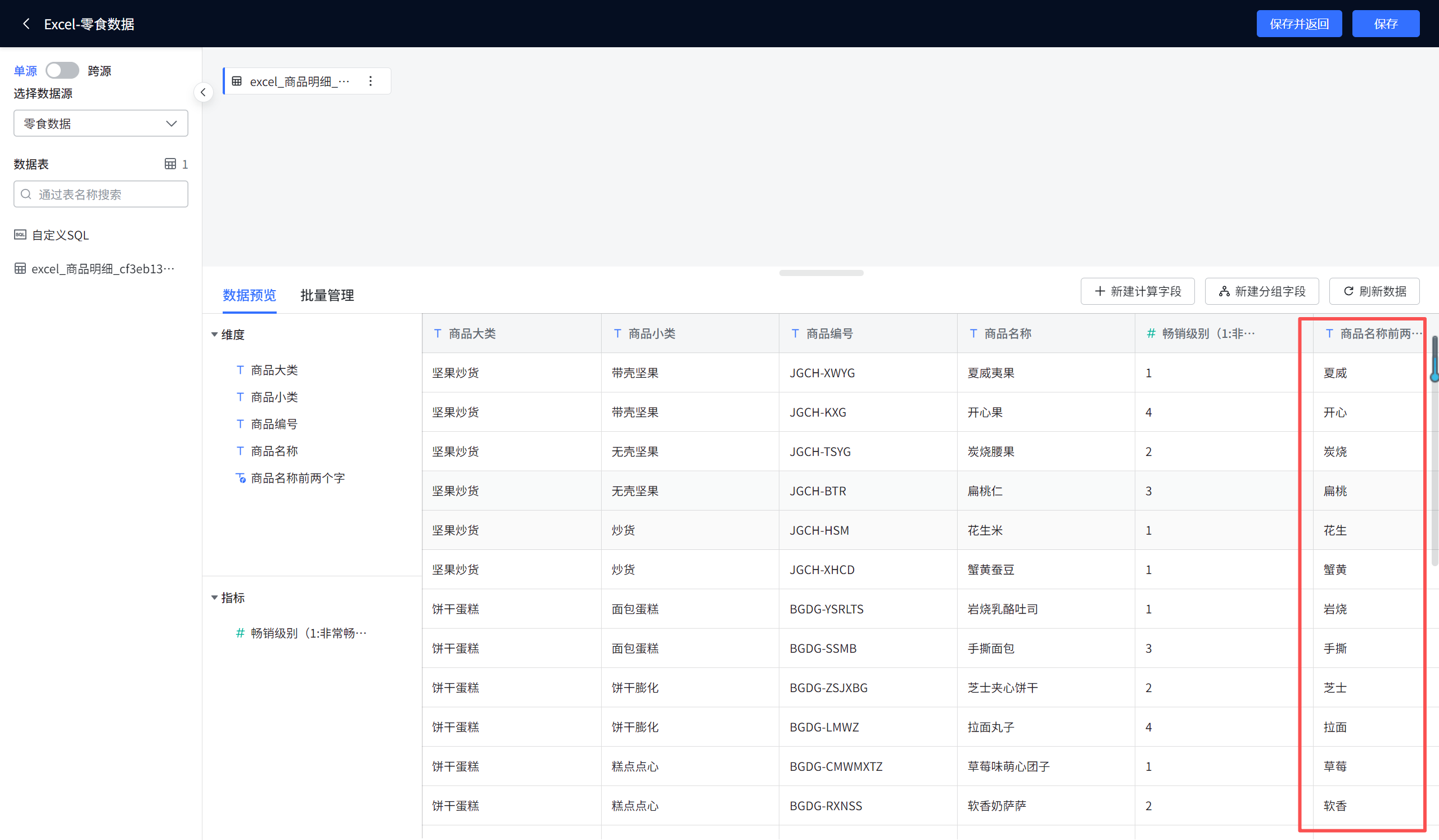 商品名称前两个字会出现在字段列表中(见图7-24)。图7-24 计算字段"商品名称前两个字"添加成功