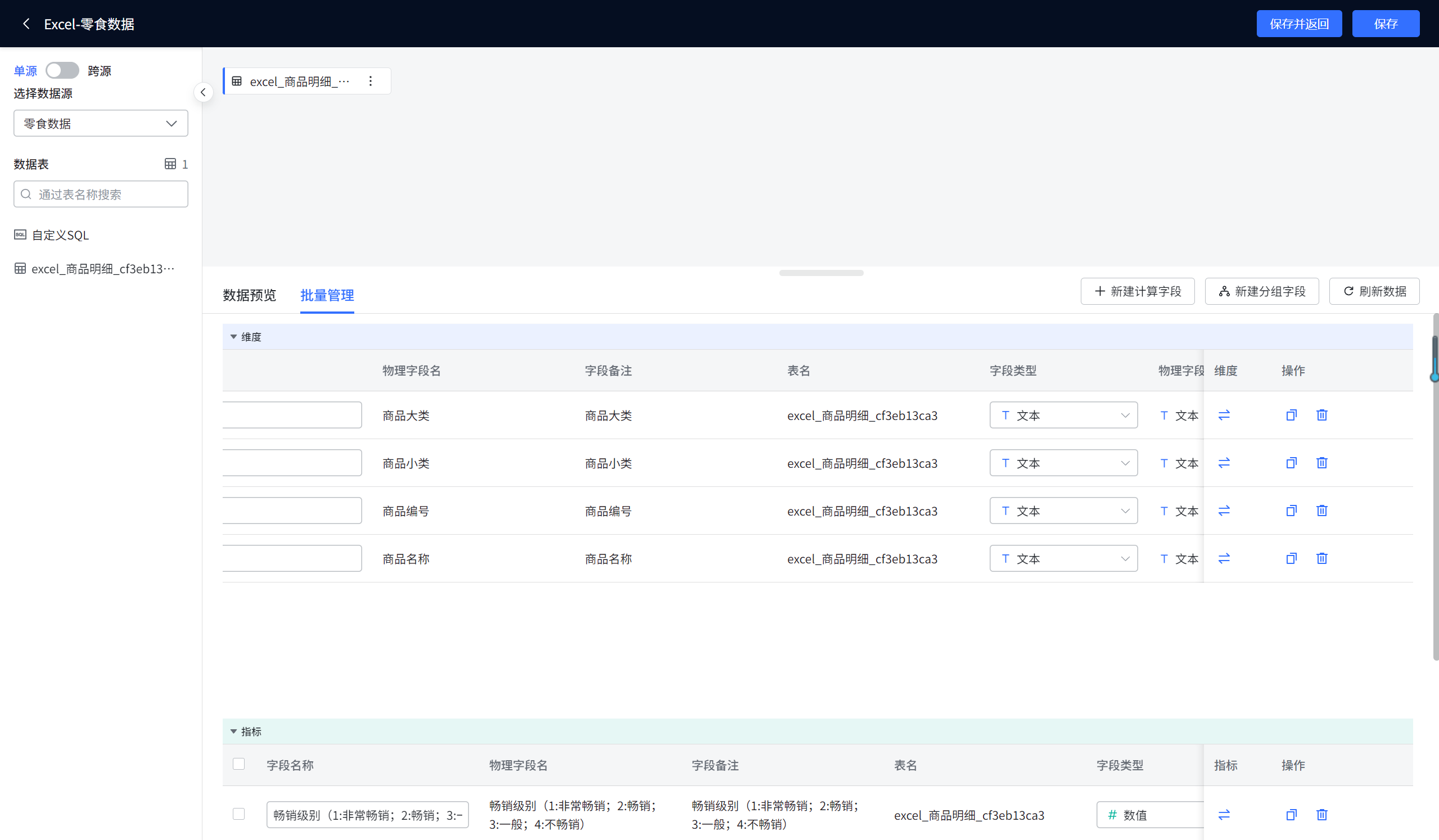 批量管理操作:对于关联数据集等复杂情况,DataEase还提供了更高级的批量管理界面。如图7-21所示,您可以在此界面集中查看和修改所有来源表的字段及其属性,管理效率更高。