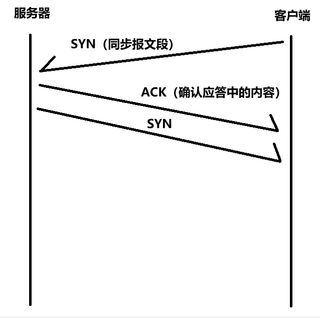 特殊的TCP数据包、没有载荷不携带应用层数据、六个标志位中的第五位(SYN)数值为:1。 虽然SYN不带有应用层载荷,但是会带有IP报头/以太网数据帧帧头,也有TCP报头,还包含有客户端自己的端口和IP地址。这些的目的都是为了告诉服务器:"我是xxx,我的IP是xxx,和我建立连接"