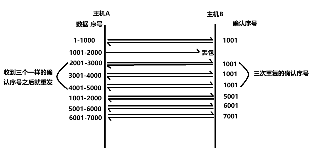 关键要点还是上个例子说的,此处三次返回的应答报文(确认序号)是1001,而不是3001,因为确认序号就代表了这个序号之前的数据已经收到了,3001意思就是3001之前的所有数据都收到了,但是这里显然不是,1001-2000的数据丢了 - 在上述重传的过程中,整体的效率是很高的,这里的重传具有
