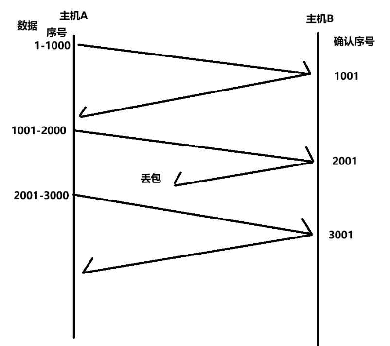确认序号的含义,图中第一条的1001序号意思就是1001之前的数据都收到了,后续即使2001丢了,但是2001后的3001没丢,3001就代表3001之前的数据都收到了 举个例子:这就好比在外面搭讪一个陌生人一样,但是这个陌生人说"我都有孩子了",这里的这句话意思就是TA都结婚了,也就包括了谈恋爱这步- 2、发送方发出的数据丢了:
