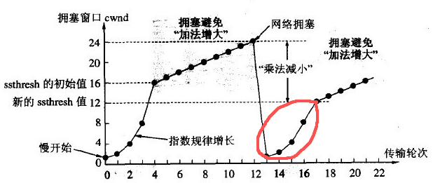 值得注意的是这张图是教材上的经典版,该版本在到达顶峰的阈值之后,会先回到慢启动的状态,然后再指数增长,再线性增长。但在新版已经不会按照中图中画红圈的部分执行了