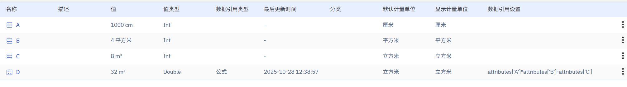 例如有属性 A 单位是厘米 (cm), 属性 B 单位是平方米 (m2),属性 C 的单位是立方米 (m3)。这里涉及 3 个计量单位分类,分别是:长度、面积和体积。对于公式 A*B-C, 会先把 A 转换成计量单位为米的值,然后与 B 相乘得到的结果的计量单位是立方米,最后再与 C 进行减法运算。如下图: