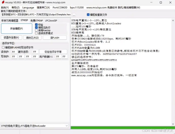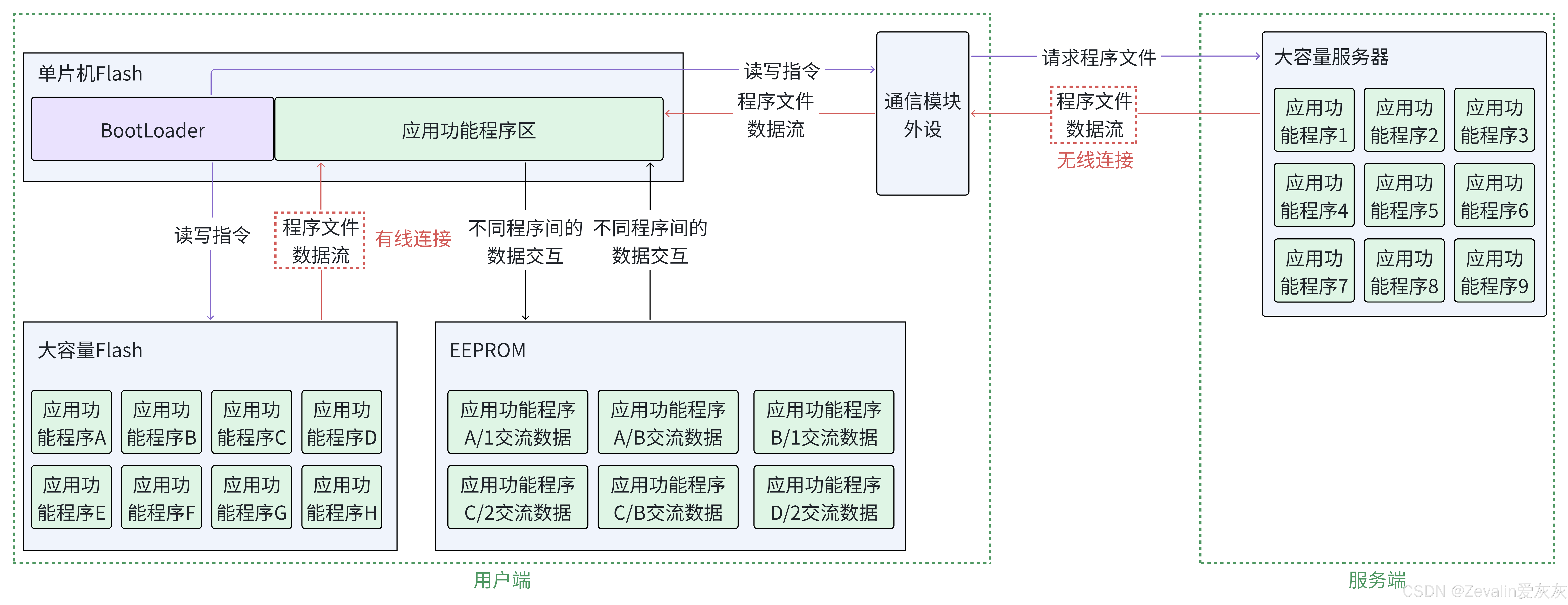 1\] 从Flash启动:单片机启动后进入正常工作状态。 \[2\] 下载启动:单片机启动后从串口下载程序。 \[3\] 从SARM启动:用于一些调试场合,不太常见,此处不进行详细介绍。  ③该电路通过BOOT0、DTR和RTS控制RST的电平,其中DTR和RTS由CH340C芯片输出,而CH340C芯片又通过USB通信与上位机交互,所以在上位机中可以直接配置DTR和RTS,同时在开发板上通过跳线帽可选择BOOT0和BOOT1的电平,由此控制单片机启动方式。需要说明的是,CH340C芯片中DTR和RTS使用的是负电平逻辑(可通过标识"#"识别),上位机中将它们配置为低电平,实际上引脚出输出的是高电平。   ④电路工作原理分析(以上图刷写程序过程为例): \[1\] 当上位机配置DTR为低电平、RTS为高电平,则DTR实际为高电平、RTS实际为低电平,此时S8050导通,RTS的电平与1N4007W阴极侧电平近似相等,则RST为低电平,同时S8550也导通,BOOT0的电平与网络VCC+3.3V的电平近似相等,则BOOT0为高电平,此时BOOT1通过跳线帽连接地,则其为低电平,单片机进入BootLoader。(如上图所示,会延时100ms,主要是为了给单片机的RST引脚留出响应时间) \[2\] 单片机复位后,上位机置DTR为高电平(RTS不变),则DTR实际为低电平,此时S8050关断,RST为高电平,同时S8550导通,BOOT0的电平与网络VCC+3.3V的电平近似相等,则BOOT0为高电平,此时BOOT1通过跳线帽连接地,则其为低电平,由此可知,此刻单片机结束复位状态,进入下载启动模式,开始从串口下载程序。 \[3\] 程序刷写完毕后,上位机置RTS为低电平(DTR不变),则RTS实际为高电平,此时S8050关断,RST为高电平,同时S8550关断,BOOT0和BOOT1都通过跳线帽连接地,则它们均为低电平,由此可知,此刻单片机完成程序下载,进入正常工作模式。 ### 3、设置初始软件版本号 (1)使用平台的OTA功能时,单片机需要维护当前软件的版本号,与服务器连接后,将软件版本号上报,若服务器判断单片机程序版本老旧,就可以主动发送询问,确认用户是否需要升级程序。  (2)版本号需时刻保存在EEPROM中,可以在BootLoader中设计命令行,输入命令,再输入初始版本号,让BootLoader将其保存到EEPROM中,这个初始版本号相当于一个默认值,只要刷写其它版本的应用功能程序,那么这个默认值就会被覆盖。 ### 4、多程序切换 (1)设计不同的程序,让单片机能够实现不同的功能,当需要哪个程序时,就执行哪个程序的代码,但单片机的Flash空间并不是无限大,当可选程序过多时,显然不能把所有可选程序放在Flash中(Flash可以分区存放多个程序),对此可以将暂不使用的程序存储在外部大容量Flash中(如W25Q64),当需要运行哪个程序,就输入相应的命令,BootLoader接收命令后将对应的程序从外设Flash中读出,并更新至A区。 (2)当然,程序不一定存储在外部大容量Flash中,也可以存放在服务器中,这样,输入响应的命令后,BootLoader就从服务器下载相应的程序,并更新至A区。 (3)如果不同程序之间存在数据交互,可以通过EEPROM实现。