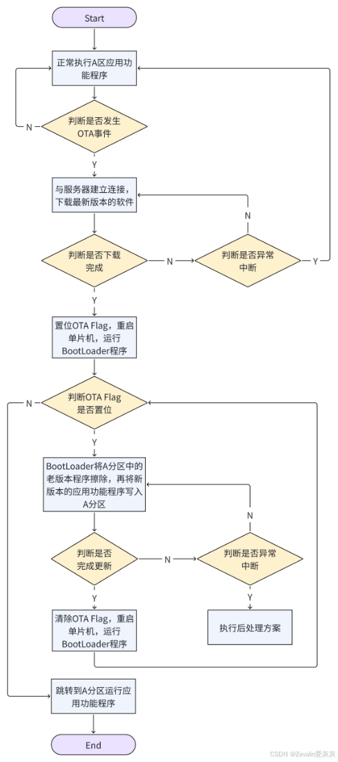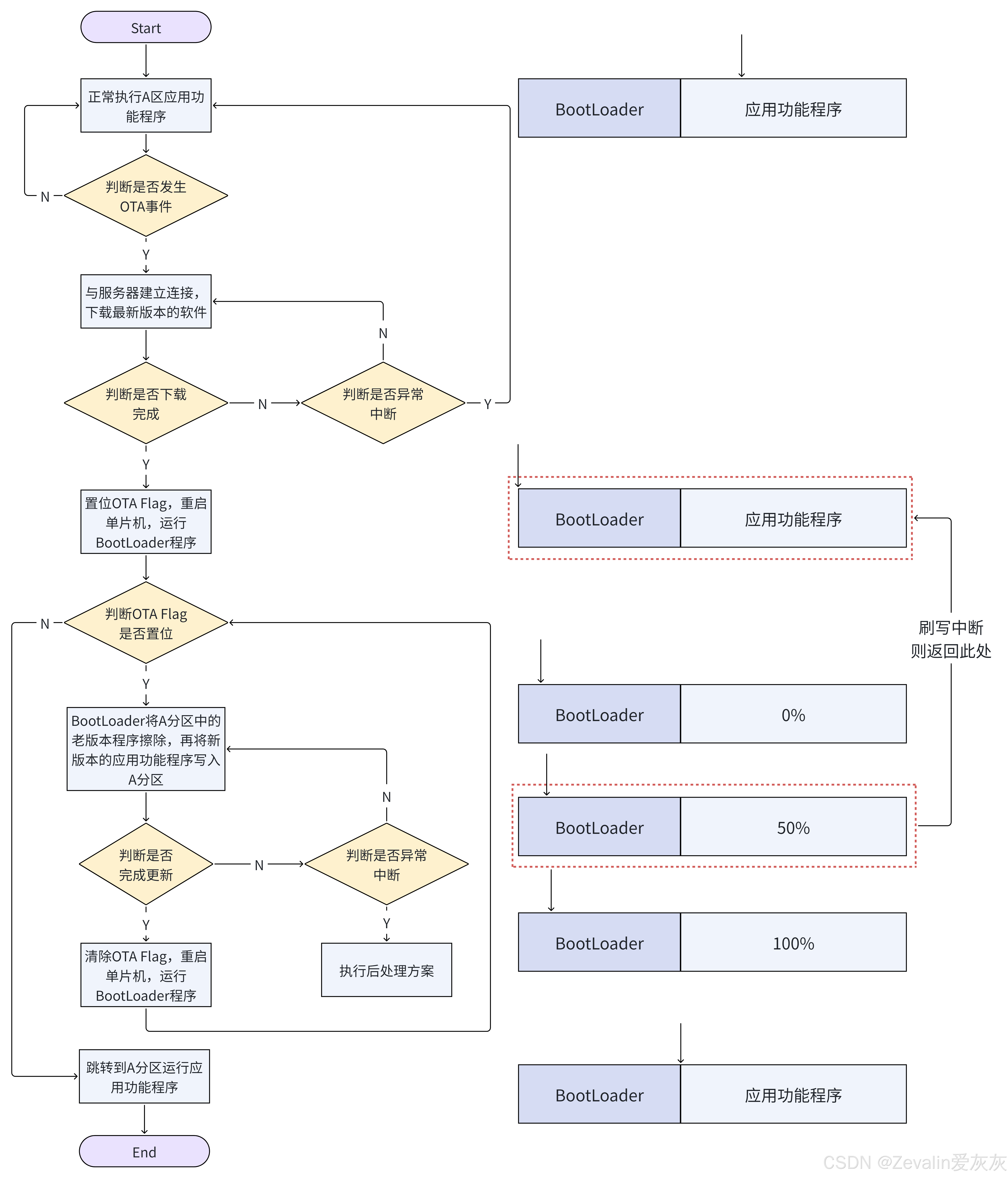 这是必须具备的功能,当OTA Flag置位时,BootLoader更新A区程序,否则将指令指针跳转至A区第一条指令,运行A区程序