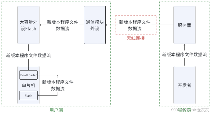 (3)OTA升级不需要找到需要刷写程序的单片机实体,当发生版本迭代时,开发者把新版本的程序上传到服务器,用户端从服务器把最新版本的程序下载后,由BootLoader负责把新版本的程序更新到Flash中,从而实现远程升级(前提是设备能够联网)。