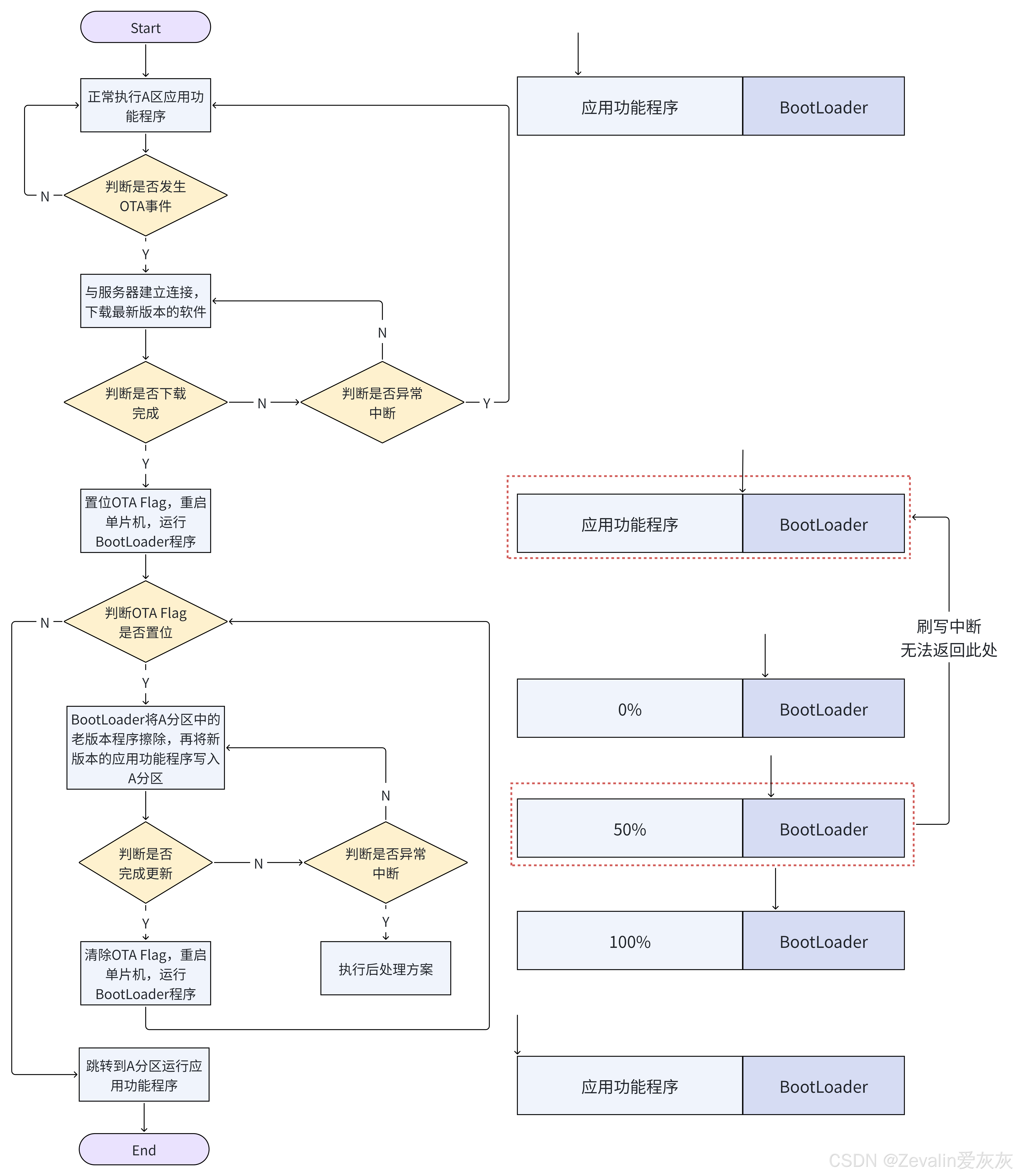 ①假设A区地址在B区之前,当发生OTA事件时,指令指针跳转到B区运行BootLoader程序,将A区中的内容擦除,再往A去写入新版本的应用功能程序,如果在刷写进度为50%时发生异常事件(如单片机掉电)导致刷写被中断,那么设备恢复正常后,指令指针仍默认指向Flash的首地址,也就是A区的第一条指令,但此时A区中的应用功能程序不完整,运行不完整的程序是很危险的,而因为指令指针无法跳转至B区,BootLoader也就无法重新更新A区的程序。