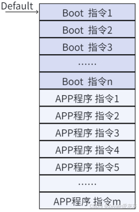 (3)当使用了BootLoader程序时,单片机不可能每次上电都把BootLoader完完整整地跑一遍,才将指令指针指向A区,因此BootLoader中应该有跳转指令,满足某些条件后,直接将指令指针指向A区。
