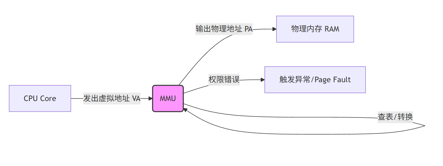 MMU 是位于CPU 与 物理内存总线 之间的硬件组件。它负责将 CPU 发出的逻辑/虚拟地址 (Virtual Address, VA) 转换为 物理地址 (Physical Address, PA) ,并在转换过程中检查访问权限。