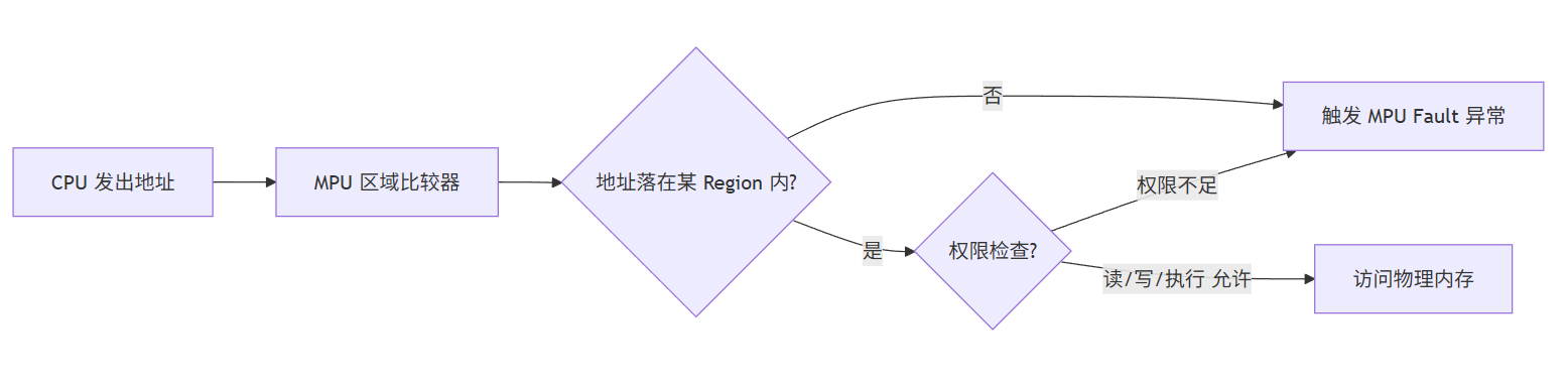 MPU 是一种硬件单元,用于定义和管理多个内存区域 (Regions),每个区域可独立配置:访问权限、缓存策略、执行权限等。