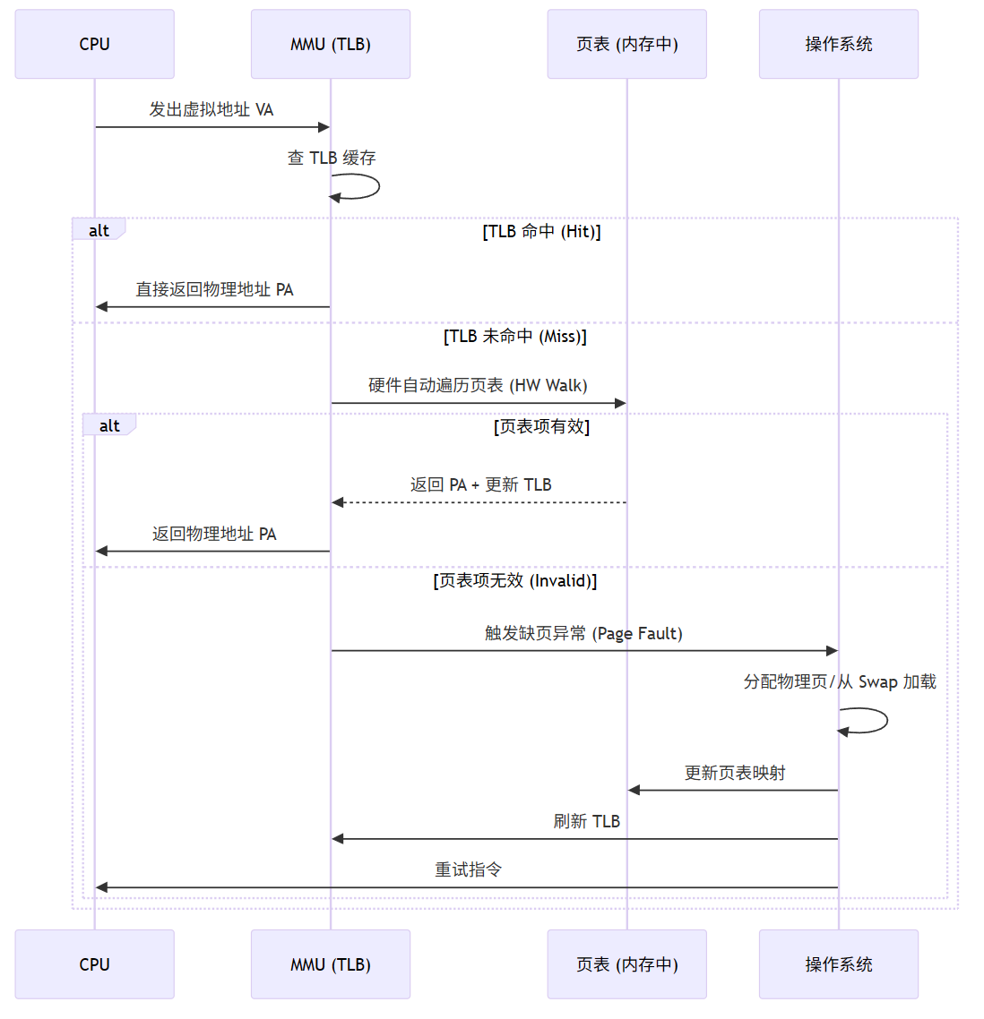 - TLB Flush: 进程切换时,若地址空间不同,需清空 TLB 防止错用映射(开销大)。