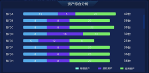 "资产综合分析"模块,以部门为单位,对企业"物理资产""虚拟资产""应用资产"数量统计分析,并展示各部门内不同资产类型的比例关系和总量。在设计版本中,我们改变模块内的布局和交互方式,以雷达图方式展示部门内部不同资产类型的数量关系和总量,并通过颜色来区分不同部间的数据。内容扩展性方面,采用左右横向翻页样式,可自由设定系统自动翻页切换和手动点击切换,不仅丰富了页面展示方式,又增加交互趣味性,数据切换过程中动效的使用也进一步增加界面的科技感和"数据之美"。