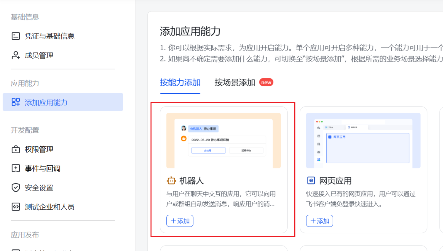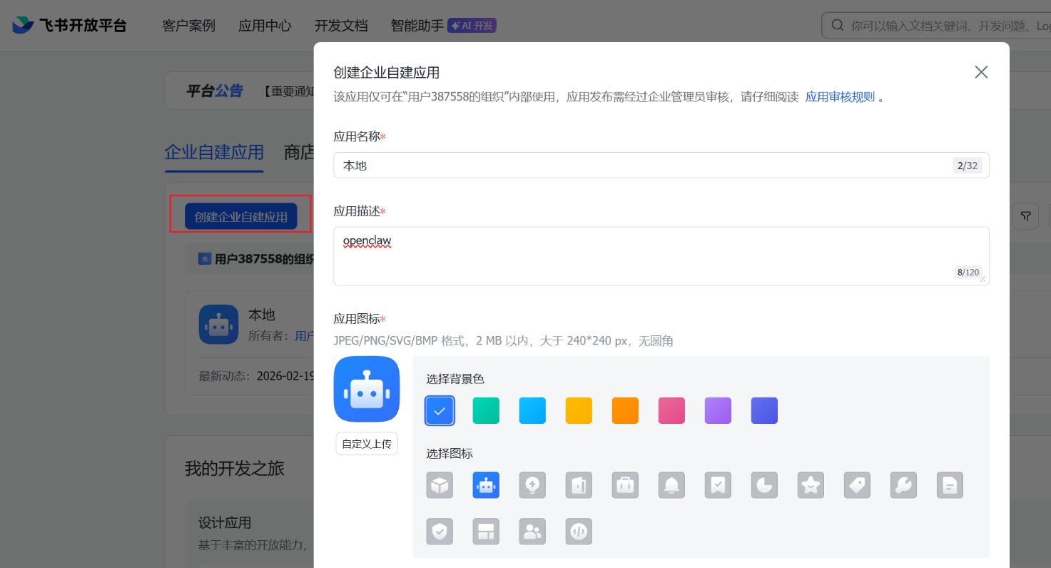 - 创建企业自建应用 → 选择机器人类型 → 填写基本信息 → 创建。
