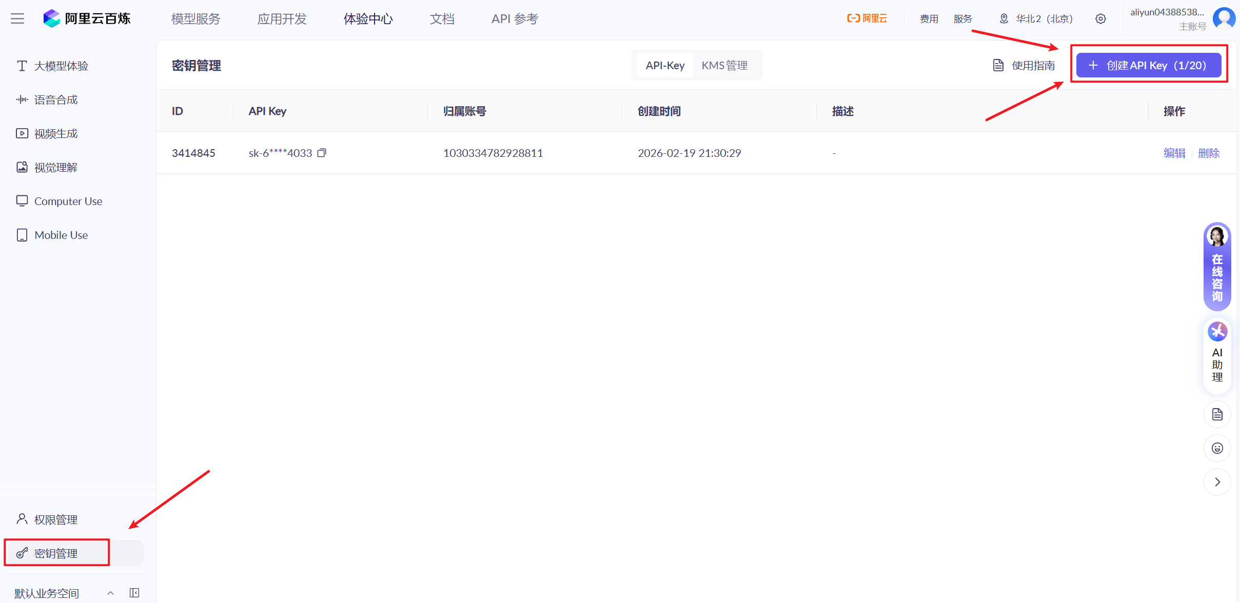 - 登录后,进入左侧菜单 密钥管理 → 创建 API Key。
